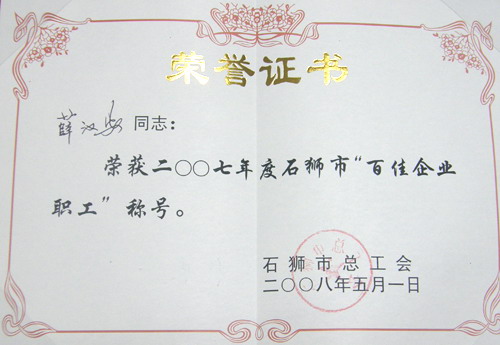 | 薛漢安同志榮獲2007年度石獅市“百佳企業職工”稱號 |